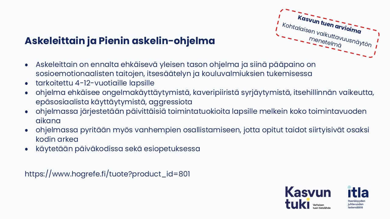 Askeleittain / Pienin Askelin on oppimista, sosiaalista kehitystä ja tunnetaitoja tukeva opetusohjelma varhaiskasvatukseen, esi- ja alkuopetukseen. Askeleittain / Pienin askelin on  Kasvun tuen menetelmäarviossa kohtalaisen dokumentoidun näytön menetelmäksi.