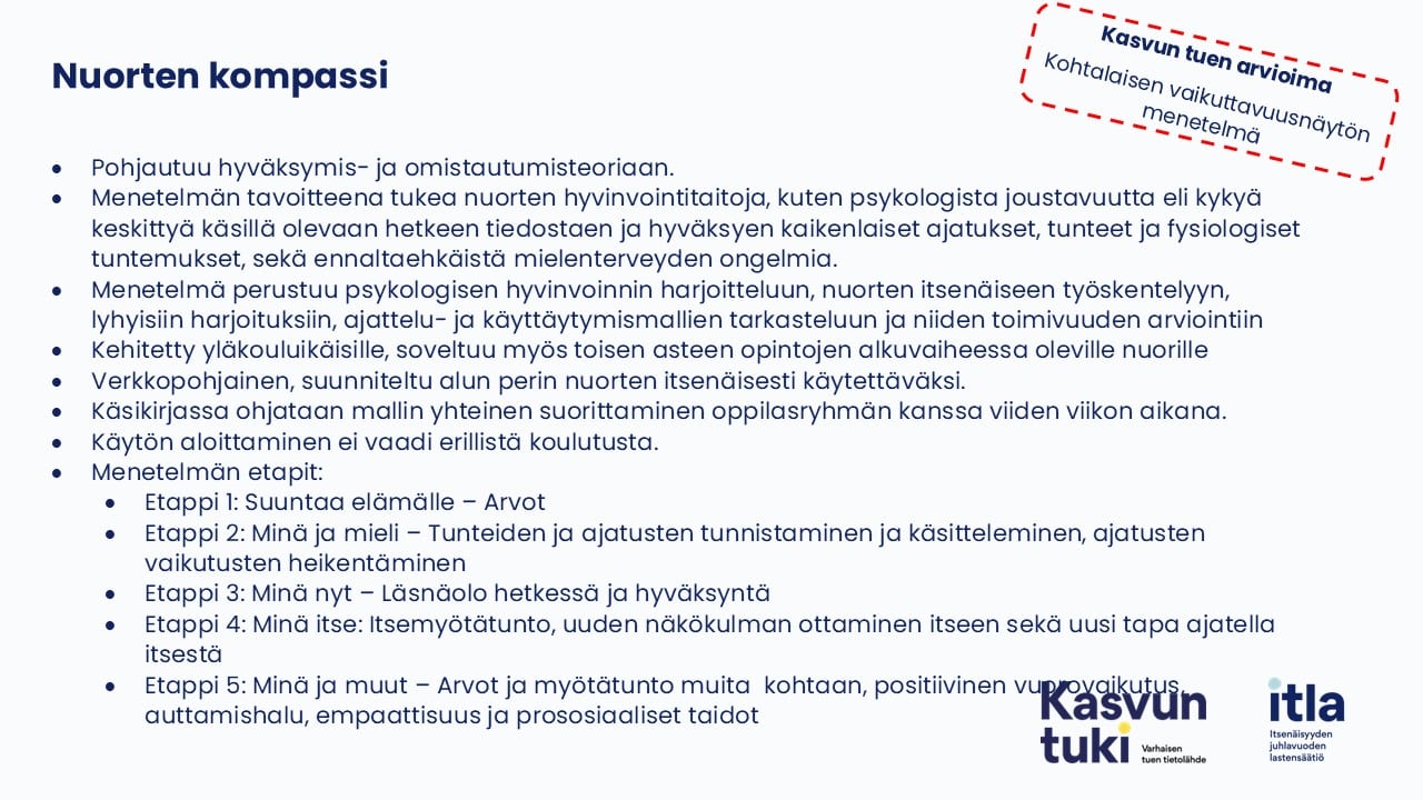 Nuorten Kompassi -menetelmä on psykologisen hyvinvoinnin harjoitteluun perustuva verkko-ohjelma yläkouluikäisille, jonka voi ottaa ryhmässä käyttöön manuaalin avulla tai ohjata oppilaita ohjelman itsenäiseen käyttöön. Menetelmä on kehitetty  Jyväskylän yliopiston psykologian laitoksella. Se on arvioitu Kasvun tuen menetelmäarviossa kohtalaisen dokumentoidun näytön 4/5 menetelmäksi.