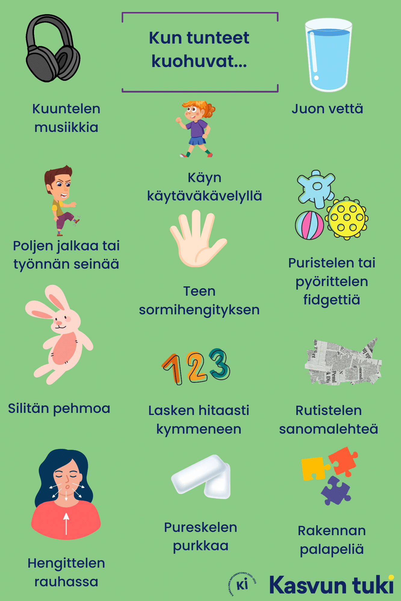 Tunnekuvia, -mittareita ja muita tunnesäätelyä tukevia julisteita voi myös olla esillä ryhmätiloissa, luokissa ja käytävillä. Visuaaliset tunnetaitojen muistukkeet tukevat lasten ja nuorten tunnesäätelyä ja niihin on aikuisten myös helppo tarpeen tullen viitata.
