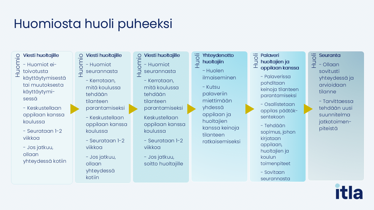 Kun lapsen tai nuoren käyttäytymisessä havaitaan jotain tavallisesta poikkeavaa, on hyvä lapsen ja nuoren jututtamisen jälkeen olla matalalla kynnyksellä yhteydessä kotiin, kertoa havainnoista ja kysyä kodin kuulumisia. Huoltajien kanssa voidaan sopia, kuinka lasta tai nuorta aiotaan tukea ja että ammattilaiset seuraavat tilannetta varhaiskasvatuksessa tai koulussa jonkun sovitun ajan, esimerkiksi 1-2 viikkoa. Sovitun ajan jälkeen ollaan uudelleen yhteydessä jaetaan havaintoja ja pohditaan jatkoa. Kun huoltajia kutsutaan yhteistyöhön, voimme ammattilaisina herättää keskustelua esimerkiksi toteamalla: