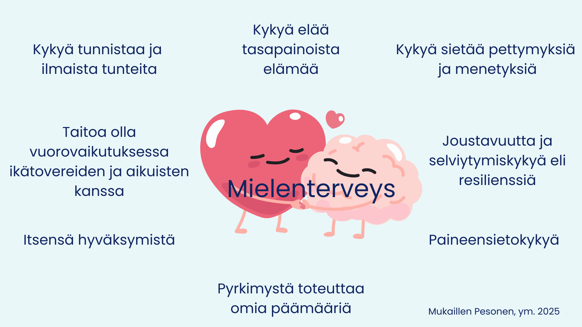 Mielenterveys voidaan määritellä hyvinvoinnin tilaksi, jossa yksilö pystyy tunnistamaan omat kykynsä, kykenee oppimaan ja osallistumaan oman yhteisönsä toimintaan sekä selviytymään ikätasoisesti oman elämänsä haasteista. Mielenterveyteen liittyy myönteinen käsitys itsestä, ikätasoinen kyky hallita ajatuksia ja tunteita sekä olla vuorovaikutuksessa ympäristönsä kanssa.